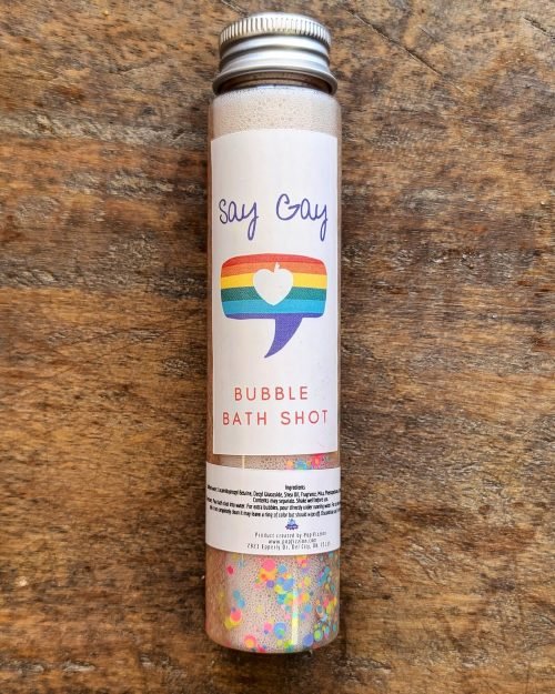 Say Gay bubble bath shot is full of rainbow biodegradable glitter and smells like fruity pebbles. It shimmers and shines just like our community.